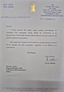 ଜୁଏଲ୍ ଙ୍କ ଦସ୍ତଖତରେ ହୋଇଥିବା ଚିଠିରେ ଶ୍ରୀ ବାଗୁନ୍ ଗାଗରାଇଙ୍କୁ ଖଣ୍ଡାଧାର କୁରୁମିତ୍ର ମାଇନସ୍ ରେ ସାଂସଦଙ୍କ ପ୍ରତିନିଧି ଭାବେ ଅଧିକୃତ କରାଯାଇଛି । ସାଂସଦଙ୍କ ପକ୍ଷରୁ ସେ ବିଭିନ୍ନ କଥା ବୁଝାବୁଝି କରିବେ । ବିଭିନ୍ନ କାର୍ଯ୍ୟ ସମ୍ପର୍କରେ ଅଫିସରମାନଙ୍କ ସହ କଥା ହେବେ । ସବୁ ବୈଠକରେ ଯୋଗଦେଇ ସାଂସଦଙ୍କ ପକ୍ଷରୁ ଅନୁମୋଦନ ଏବଂ ପରାମର୍ଶ ରଖିବେ ବୋଲି ଉଲ୍ଲେଖ କରାଯାଇଛି ।