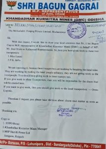 ସେହିଭଳି, ଦେଓଝର ଜେଏସପିଏଲ ମ୍ୟାନେଜର, ବିଲେଇପଦାଙ୍କୁ ସେହି ୩ ତାରିଖରେ ଆଉ ଏକ ଚିଠି କରିଥିଲେ ବାଗୁନ୍ ଗାଗରାଇ । ଖଣ୍ଡାଧାର ମାଇନ୍ସରୁ ପ୍ରତିଦିନ ହଜାର ହଜାର ଟନ୍ ର କଞ୍ଚାମାଲ ଦେଓଝର ଜେଏସପିଏଲ ବିଲେଇପଦାକୁ ଯାଉଥିବା ବେଳେ ଗୋଟେ ଲୋକାଲ୍ ଟ୍ରାନସପୋର୍ଟରକୁ ସଂଯୋଗ କରିବାକୁ ସେ ଚାପ ପକାଇଥିଲେ । ଏହା ନ ହେଲେ ଆଗାମୀ ଦିନରେ ଅଶାନ୍ତିର ବାତାବରଣ ସୃଷ୍ଟି ହେବ ବୋଲି ଚେତାବନୀ ଦେଇଥିଲେ ।